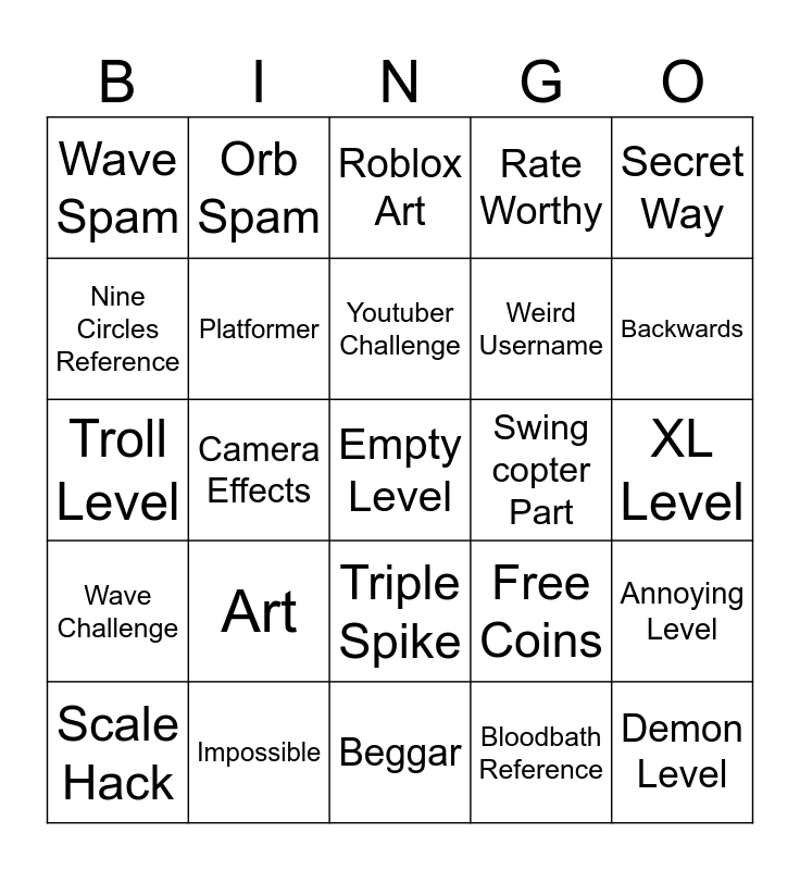 This bingo card has a free space and 24 words: Art, Impossible, Youtuber Challenge, Scale Hack, Secret Way, Wave Spam, Nine Circles Reference, Orb Spam, Swing copter Part, Triple Spike, Weird Username, Troll Level, Free Coins, Annoying Level, Platformer, Bloodbath Reference, XL Level, Roblox Art, Backwards, Camera Effects, Demon Level, Wave Challenge, Rate Worthy and Beggar.