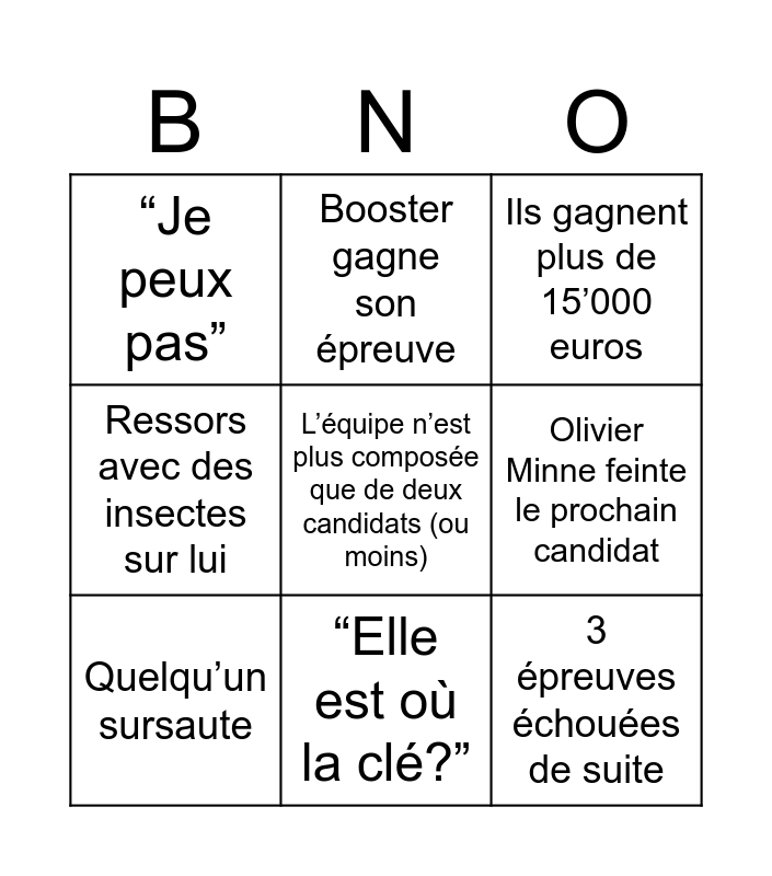 This bingo card has a free space and 8 words: Olivier Minne feinte le prochain candidat, Ils gagnent plus de 15’000 euros, Booster gagne son épreuve, Quelqu’un sursaute, “Je peux pas”, 3 épreuves échouées de suite, Ressors avec des insectes sur lui and “Elle est où la clé?”.
