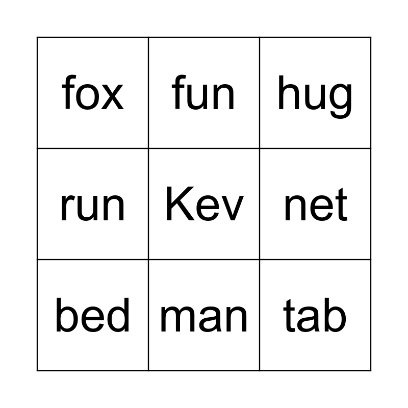 This bingo card has a free space and 11 words: dip, man, tab, bed, fun, hug, net, pip, run, fox and box.