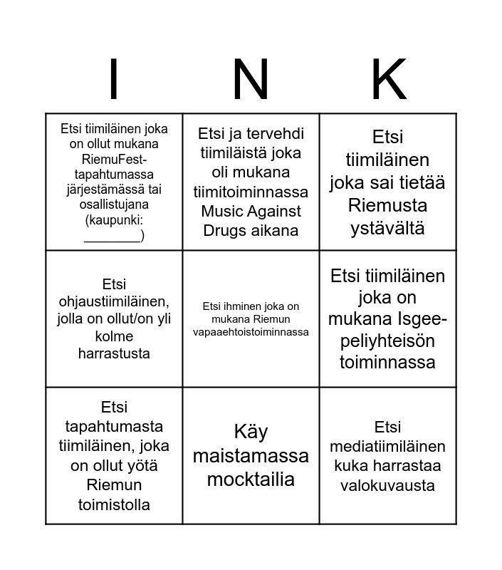 This bingo card has 24 words: Löydä Mini-Mark Kelly (piilotetaan niitä tapahtumapaikalle?), Etsi ja tervehdi viidestä eri tiimistä ainakin yhtä henkilöä, Käy maistamassa mocktailia, Etsi ja tervehdi jokaisen vuodenajan tiimiläistä: Kevät, kesä, syksy, Etsi ihminen joka on mukana Riemun vapaaehtoistoiminnassa, Etsi tiimiläinen joka on ollut mukana RiemuFest-tapahtumassa järjestämässä tai osallistujana (kaupunki: ________), Etsi tiimiläinen joka on mukana Isgee-peliyhteisön toiminnassa, Etsi ja tervehdi tiimiläistä joka oli mukana tiimitoiminnassa Music Against Drugs aikana, Etsi pelitiimiläinen joka oli mukana ohjelmoimassa pelitiiminsä videopeliä, Etsi ja tervehdi kolmen eri tiimin liidereitä eri vuosilta, Etsi mediatiimiläinen kuka harrastaa valokuvausta, Etsi kolme jäsentä eri vuosien bänditiimien bändeistä ja kysy heidän instrumenttinsa, Etsi ja tervehdi tiimiläistä, joka oli oppisopimuksella mukana Ink-tiimissään, Etsi tiimiläinen joka tuli tapahtumaan toiselta paikkakunnalta, Etsi tapahtumasta tiimiläinen, joka on ollut yötä Riemun toimistolla, Etsi tapahtumasta tiimiläinen joka puhuu kolmea eri kieltä, Etsi tiimiläinen joka vaihtoi tiimiä tiimijakson aikana, Etsi tiimiläinen joka sai tietää Riemusta ystävältä, Etsi tiimiläinen joka sai tietää Riemusta Työllisyyspalveluilta, Kysy kuulumisia tiimiläiseltä, kenelle et ole koskaan puhunut aikaisemmin, Tervehdi tiimiläistä, joka oli kipeänä enemmän kuin kahdesti Ink-tiimijakson aikana, Etsi ja tervehdi taidetiimiläistä, joka on tehnyt rahaa taiteellaan, Etsi ohjaustiimiläinen, jolla on ollut/on yli kolme harrastusta and Etsi ja tervehdi tiimiläistä, joka on esiintynyt Riemun Instagram-tilillä.