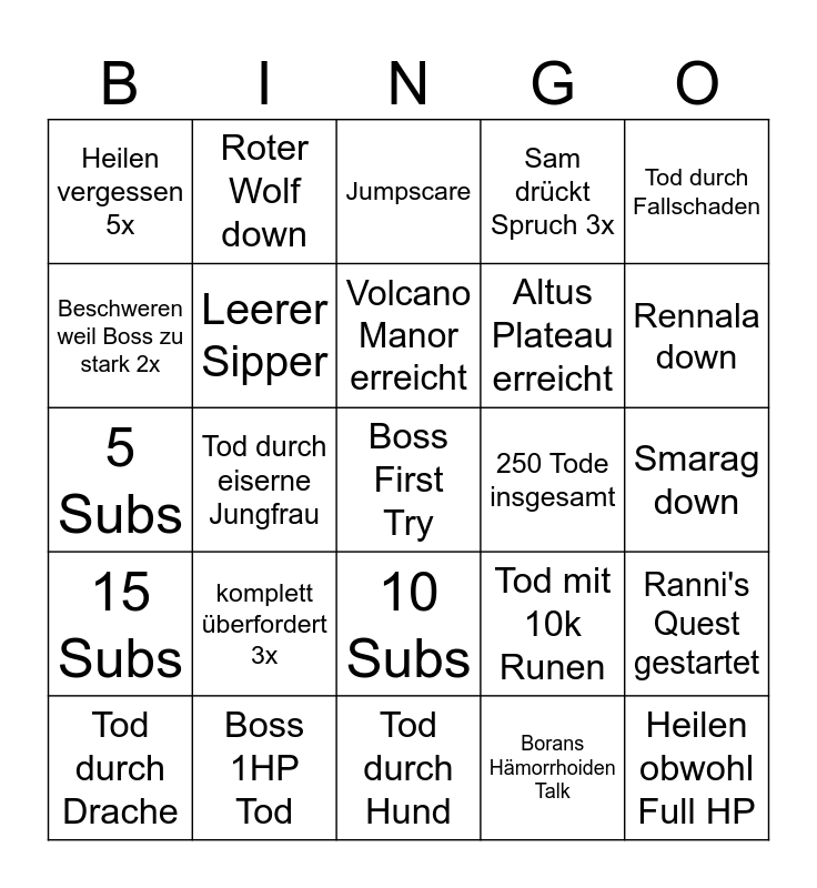 This bingo card has a free space and 24 words: komplett überfordert 3x, Boss 1HP Tod, Volcano Manor erreicht, Tod durch Drache, Tod durch Fallschaden, Heilen vergessen 5x, Beschweren weil Boss zu stark 2x, Roter Wolf down, 250 Tode insgesamt, 10 Subs, Altus Plateau erreicht, 5 Subs, Tod mit 10k Runen, Ranni's Quest gestartet, Leerer Sipper, Borans Hämorrhoiden Talk, Smarag down, Jumpscare, Rennala down, Tod durch eiserne Jungfrau, Heilen obwohl Full HP, 15 Subs, Sam drückt Spruch 3x and Tod durch Hund.