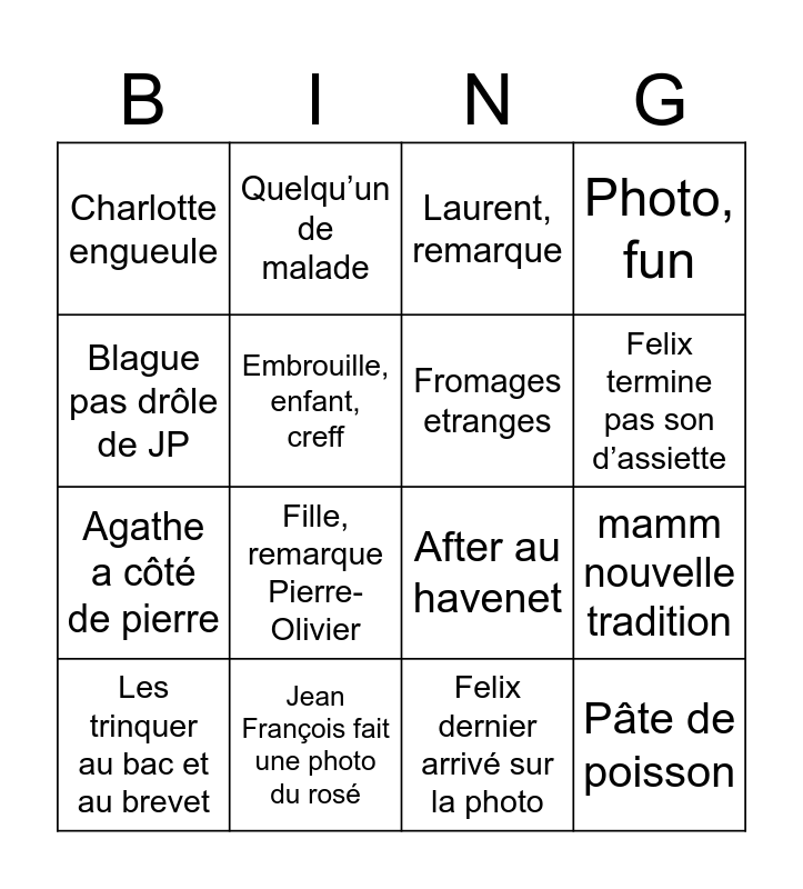 This bingo card has 16 words: Jean François fait une photo du rosé, mamm nouvelle tradition, Laurent, remarque, Charlotte engueule, Agathe a côté de pierre, Quelqu’un de malade, After au havenet, Felix dernier arrivé sur la photo, Blague pas drôle de JP, Embrouille, enfant, creff, Les trinquer au bac et au brevet, Photo, fun, Fille, remarque Pierre-Olivier, Felix termine pas son d’assiette, Fromages etranges and Pâte de poisson.