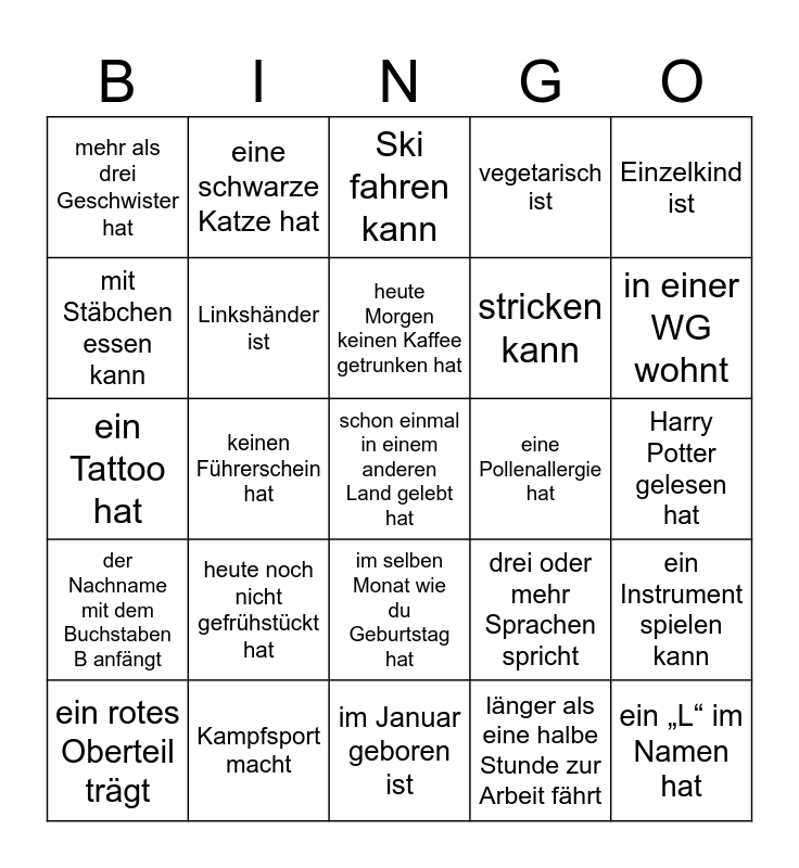 This bingo card has 25 words: heute noch nicht gefrühstückt hat, im Januar geboren ist, heute Morgen keinen Kaffee getrunken hat, ein rotes Oberteil trägt, Einzelkind ist, mehr als drei Geschwister hat, mit Stäbchen essen kann, eine schwarze Katze hat, eine Pollenallergie hat, im selben Monat wie du Geburtstag hat, stricken kann, ein Tattoo hat, drei oder mehr Sprachen spricht, ein Instrument spielen kann, Linkshänder ist, ein „L“ im Namen hat, Harry Potter gelesen hat, Ski fahren kann, in einer WG wohnt, keinen Führerschein hat, schon einmal in einem anderen Land gelebt hat, Kampfsport macht, der Nachname mit dem Buchstaben B anfängt, vegetarisch ist and länger als eine halbe Stunde zur Arbeit fährt.