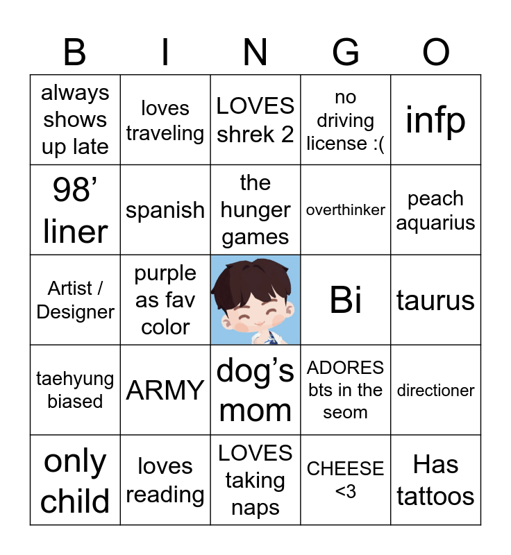This bingo card has a free space and 24 words: ARMY, loves reading, the hunger games, only child, infp, always shows up late, 98’ liner, loves traveling, Bi, dog’s mom, overthinker, Artist / Designer, ADORES bts in the seom, directioner, spanish, CHEESE <3, taurus, LOVES shrek 2, peach aquarius, purple as fav color, Has tattoos, taehyung biased, no driving license :( and LOVES taking naps.