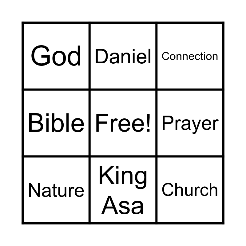 This bingo card has a free space and 8 words: Prayer, Connection, Daniel, Nature, God, Church, Bible and King Asa.