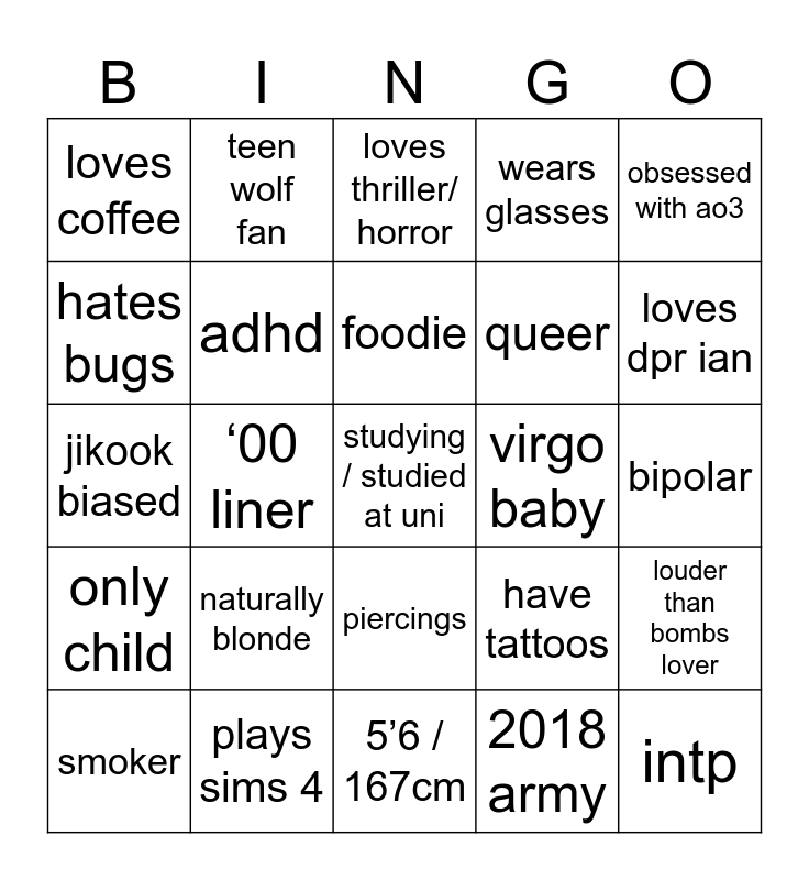 This bingo card has 25 words: naturally blonde, 5’6 / 167cm, foodie, smoker, obsessed with ao3, loves coffee, hates bugs, teen wolf fan, virgo baby, piercings, queer, jikook biased, have tattoos, louder than bombs lover, adhd, intp, bipolar, loves thriller/ horror, loves dpr ian, ‘00 liner, studying / studied at uni, plays sims 4, only child, wears glasses and 2018 army.