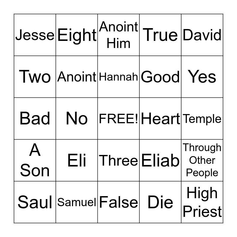 This bingo card has a free space and 24 words: Eli, Samuel, Hannah, Saul, David, Jesse, Two, Eight, Heart, Three, Good, Bad, Eliab, Through Other People, Anoint, Die, Temple, Anoint Him, Yes, No, High Priest, A Son, True and False.