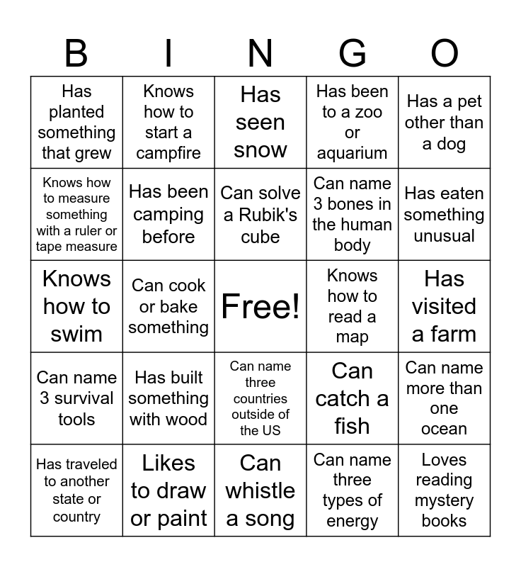 This bingo card has a free space and 33 words: Has been on an airplane, Speaks more than one language, Can cook or bake something, Loves science experiments, Can name 3 survival tools, Has been camping before, Has a pet other than a dog, Has traveled to another state or country, Knows how to start a campfire, Loves to build things, Can solve a Rubik's cube, Has seen snow, Has used a compass, Has watched a space launch or rocket video, Knows how to read a map, Has eaten something unusual, Likes to draw or paint, Knows how to swim, Has built something with wood, Can catch a fish, Can name three countries outside of the US, Knows how to sew or stitch, Has planted something that grew, Has visited a farm, Can whistle a song, Loves reading mystery books, Has been to a zoo or aquarium, Can name 3 bones in the human body, Knows how to measure something with a ruler or tape measure, Can name more than one ocean, Has been to the beach, Can name three types of energy and Knows how to ride a bike.