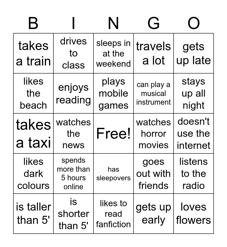 This bingo card has a free space and 34 words: plays a sport, gets up early, likes cats, walks to class, likes dark colours, enjoys reading, gets up late, is taller than 5', drives to class, likes light colours, plays mobile games, sleeps in at the weekend, takes the bus to class, spends less than 5 hours online, watches horror movies, stays up all night, is shorter than 5', takes a taxi, spends more than 5 hours online, goes out with friends, has sleepovers, eats out for dinner, takes a train, doesn't use the internet, likes to read fanfiction, loves flowers, travels a lot, likes singing, can play a musical instrument, likes the beach, likes the mountains, watches the news, listens to the radio and hates mice.
