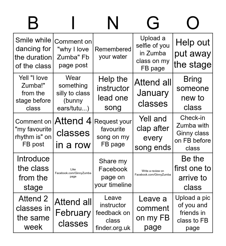 This bingo card has 25 words: Like Facebook.com/GinnyZumba page, Leave instructor feedback on class finder.org.uk, Help the instructor lead one song, Attend 2 classes in the same week, Help out put away the stage, Smile while dancing for the duration of the class, Yell "I love Zumba!" from the stage before class, Comment on "why I love Zumba" Fb page post, Yell and clap after every song ends, Share my Facebook page on your timeline, Attend all January classes, Comment on "my favourite rhythm is" on FB post, Write a review on Facebook.com/GinnyZumba, Be the first one to arrive to class, Wear something silly to class (bunny ears/tutu...), Upload a pic of you and friends in class to FB page, Check-in Zumba with Ginny class on FB before class, Remembered your water, Bring someone new to class, Attend 4 classes in a row, Request your favourite song on my FB page, Attend all February classes, Introduce the class from the stage, Upload a selfie of you in Zumba class on my FB page and Leave a comment on my FB page.