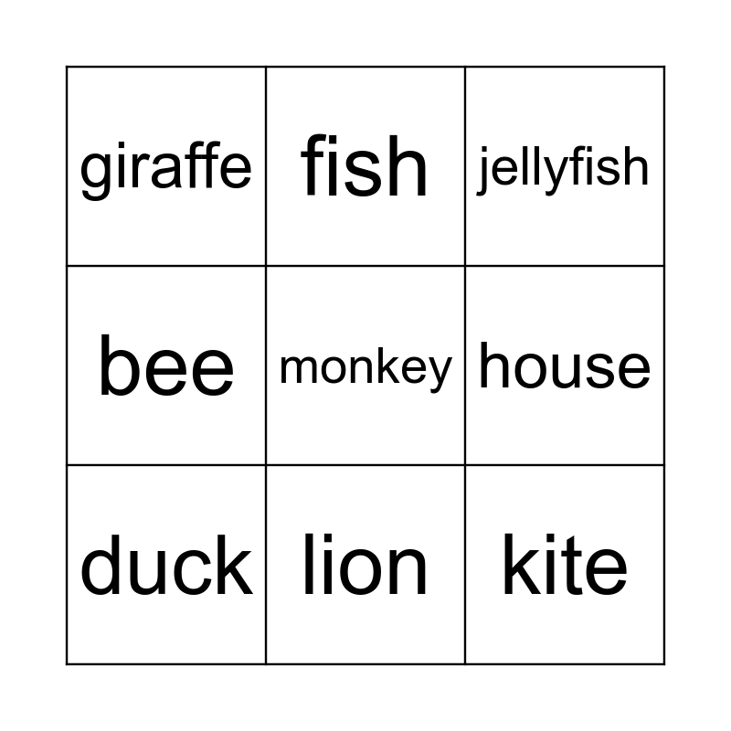 This bingo card has a free space and 8 words: house, jellyfish, fish, duck, giraffe, kite, bee and lion.