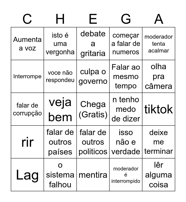 This bingo card has a free space and 24 words: falar de outros países, o sistema falhou, culpa o governo, Lag, moderador tenta acalmar, Aumenta a voz, Interrompe, isto é uma vergonha, n tenho medo de dizer, falar de outros politicos, Falar ao mesmo tempo, falar de corrupção, isso não e verdade, deixe me terminar, voce não respondeu, moderador é interrompido, tiktok, debate a gritaria, olha pra câmera, veja bem, lêr alguma coisa, rir, começar a falar de numeros and mentira.