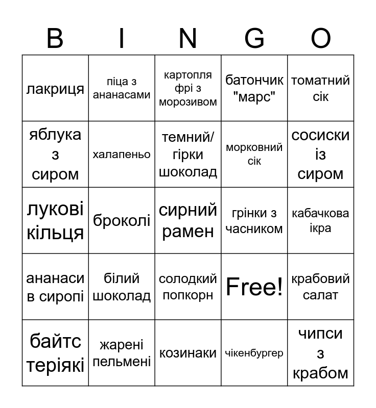 This bingo card has 25 words: білий шоколад, козинаки, темний/гірки шоколад, байтс теріякі, томатний сік, лакриця, яблука з сиром, піца з ананасами, грінки з часником, солодкий попкорн, морковний сік, лукові кільця, Free!, крабовий салат, халапеньо, чипси з крабом, кабачкова ікра, картопля фрі з морозивом, сосиски із сиром, броколі, сирний рамен, жарені пельмені, ананаси в сиропі, батончик "марс" and чікенбургер.