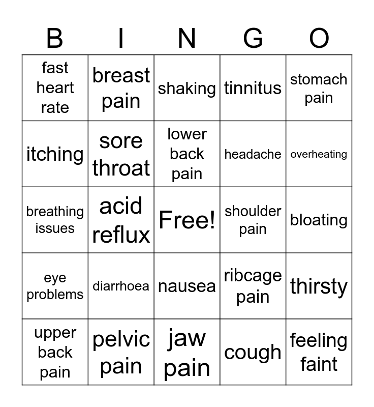 This bingo card has a free space and 24 words: diarrhoea, pelvic pain, lower back pain, upper back pain, stomach pain, fast heart rate, itching, breast pain, shoulder pain, nausea, headache, breathing issues, ribcage pain, thirsty, sore throat, cough, bloating, shaking, overheating, acid reflux, feeling faint, eye problems, tinnitus and jaw pain.