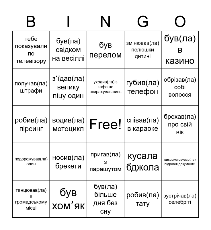 This bingo card has a free space and 24 words: носив(ла) брекети, був хомʼяк, уходив(ла) з кафе не розрахувавшись, танцював(ла) в громадському місці, був(ла) в казино, тебе показували по телевізору, получав(ла) штрафи, був(ла) свідком на весіллі, співав(ла) в караоке, пригав(ла) з парашутом, губив(ла) телефон, робив(ла) пірсинг, кусала бджола, використовував(ла) підробні документи, зʼїдав(ла) велику піцу один, робив(ла) тату, брехав(ла) про свій вік, був перелом, обрізав(ла) собі волосся, водив(ла) мотоцикл, зустрічав(ла) селебріті, подорожував(ла) один, змінював(ла) пелюшки дитині and був(ла) більше дня без сну.