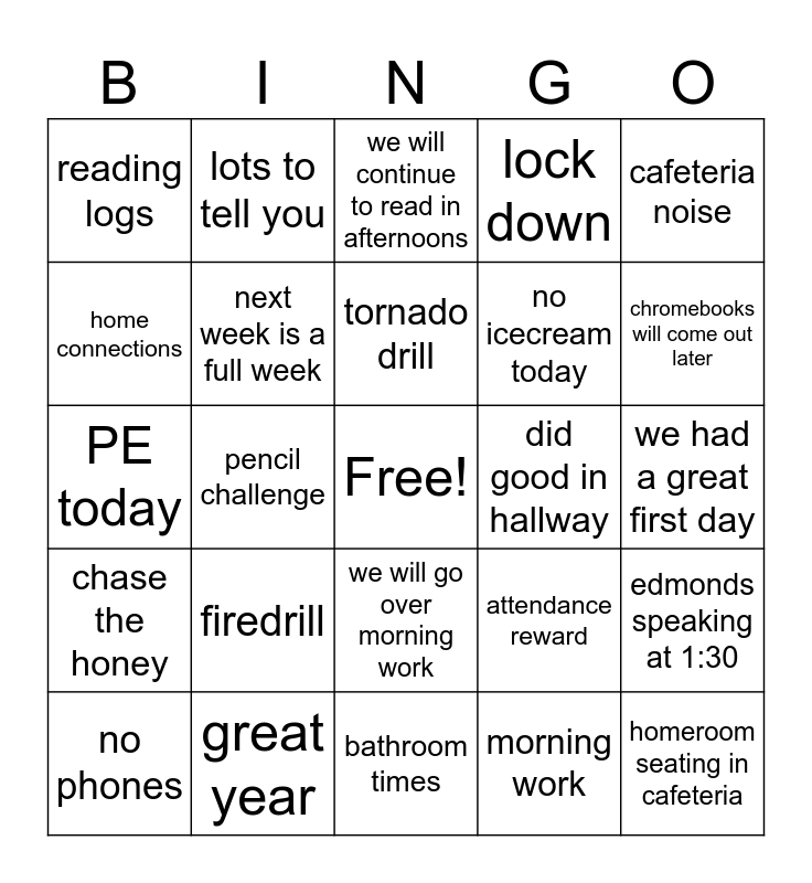 This bingo card has a free space and 24 words: firedrill, great year, tornado drill, no phones, cafeteria noise, reading logs, home connections, lots to tell you, did good in hallway, we will go over morning work, no icecream today, PE today, attendance reward, edmonds speaking at 1:30, next week is a full week, morning work, we had a great first day, we will continue to read in afternoons, chromebooks will come out later, pencil challenge, homeroom seating in cafeteria, chase the honey, lock down and bathroom times.