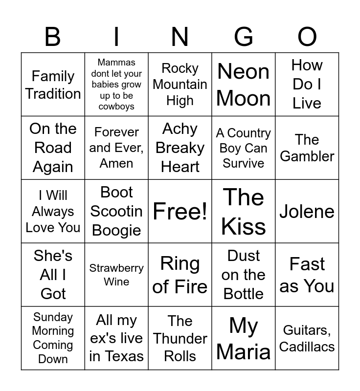 This bingo card has a free space and 49 words: A Thousand Miles from Nowhere, Guitars, Cadillacs, Copperhead Road, The Thunder Rolls, Strawberry Wine, Luckenbach, Texas, Mammas dont let your babies grow up to be cowboys, Highwaymen, On the Road Again, All My Rowdy Friends (Have Settled Down), Forever and Ever, Amen, Neon Moon, Fast as You, Dust on the Bottle, Goodbye Earl, You're still the one, Achy Breaky Heart, The Kiss, Blue, How Do I Live, Boot Scootin Boogie, My Maria, Family Tradition, A Country Boy Can Survive, Take this job and shove it, The Gambler, Sunday Morning Coming Down, Always on My Mind, Ring of Fire, She's All I Got, El Paso, I Walk the Line, The Devil went Down to Georgia, East Bound and Down, All my ex's live in Texas, You Aint Women Enough, 9 to 5, Amarillo by Morning, Jolene, Kiss an Angel Good Mornin, Rhinestone Cowboy, Thank God I'm a Country Boy, Take Me Home, Country Roads, Coal Miners Daughter, I Will Always Love You, Rocky Mountain High, Long Haired Country Boy, Amos Moses and Hello Darlin'.