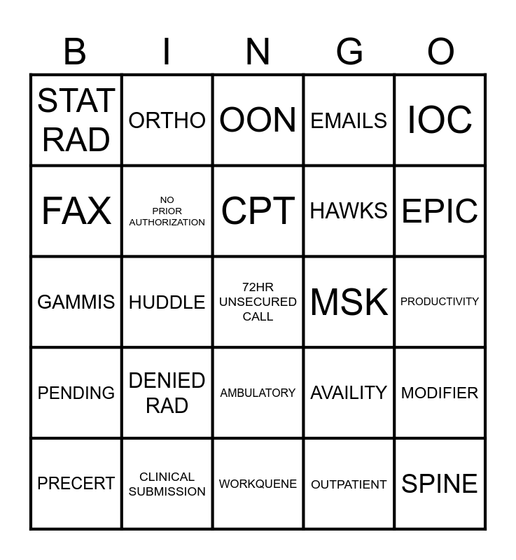 This bingo card has 30 words: PRECERT, ICD-10, CPT, EMORY, IOC, STAT RAD, ORTHO, AMBULATORY, MSK, SPINE, PENDING, NO PRIOR AUTHORIZATION, Free!, OUTPATIENT, MODIFIER, APPROVED, HUDDLE, 72HR UNSECURED CALL, AVAILITY, EPIC, GAMMIS, CLINICAL SUBMISSION, OON, HAWKS, PRODUCTIVITY, FAX, DENIED RAD, WORKQUENE, EMAILS and LEADERSHIP.
