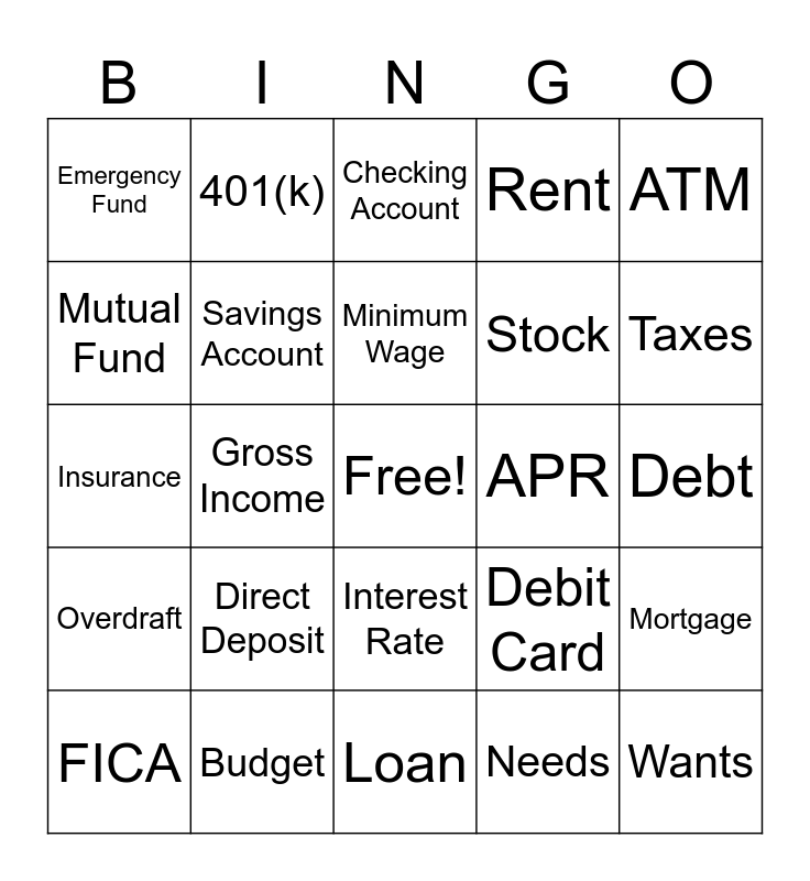This bingo card has a free space and 30 words: Budget, Net Income, Gross Income, Credit Score, Emergency Fund, Checking Account, Savings Account, Interest Rate, APR, Loan, Debt, Wants, Needs, Paycheck, Taxes, Credit Card, Debit Card, Overdraft, Direct Deposit, ATM, Insurance, Compound Interest, 401(k), Stock, Mutual Fund, Rent, Mortgage, FICA, Minimum Wage and Identity Theft.