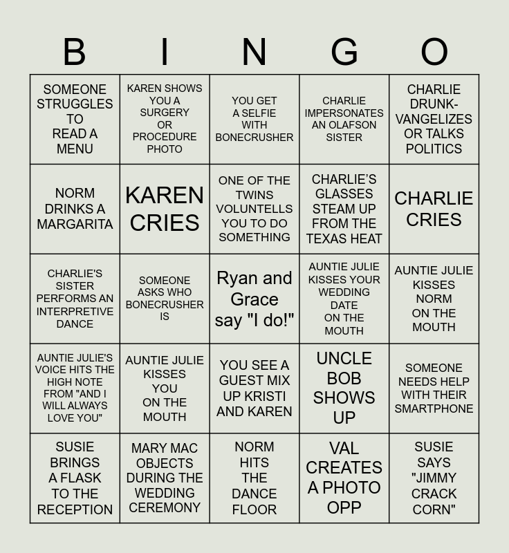 This bingo card has a free space and 24 words: AUNTIE JULIE KISSES YOU ON THE MOUTH, MARY MAC OBJECTS DURING THE WEDDING CEREMONY, ONE OF THE TWINS VOLUNTELLS YOU TO DO SOMETHING, SUSIE BRINGS A FLASK TO THE RECEPTION, CHARLIE DRUNK-VANGELIZES OR TALKS POLITICS, SOMEONE STRUGGLES TO READ A MENU, NORM DRINKS A MARGARITA, KAREN SHOWS YOU A SURGERY OR PROCEDURE PHOTO, AUNTIE JULIE KISSES YOUR WEDDING DATE ON THE MOUTH, YOU SEE A GUEST MIX UP KRISTI AND KAREN, CHARLIE’S GLASSES STEAM UP FROM THE TEXAS HEAT, CHARLIE'S SISTER PERFORMS AN INTERPRETIVE DANCE, UNCLE BOB SHOWS UP, SOMEONE NEEDS HELP WITH THEIR SMARTPHONE, KAREN CRIES, VAL CREATES A PHOTO OPP, AUNTIE JULIE KISSES NORM ON THE MOUTH, YOU GET A SELFIE WITH BONECRUSHER, CHARLIE CRIES, SOMEONE ASKS WHO BONECRUSHER IS, SUSIE SAYS "JIMMY CRACK CORN", AUNTIE JULIE'S VOICE HITS THE HIGH NOTE FROM "AND I WILL ALWAYS LOVE YOU", CHARLIE IMPERSONATES AN OLAFSON SISTER and NORM HITS THE DANCE FLOOR.