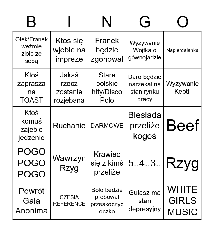 This bingo card has a free space and 24 words: Wawrzyn Rzyg, CZESIA REFERENCE, Stare polskie hity/Disco Polo, Powrót Gala Anonima, Napierdalanka, Olek/Franek weźmie zioło ze sobą, Ktoś zaprasza na TOAST, Ktoś się wjebie na impreze, Biesiada przeliże kogoś, Krawiec się z kimś przeliże, Daro będzie narzekał na stan rynku pracy, Ktoś komuś zajebie jedzenie, 5..4..3.., Rzyg, Jakaś rzecz zostanie rozjebana, Gulasz ma stan depresyjny, Beef, Franek będzie zgonowal, Wyzywanie Keptii, Ruchanie, WHITE GIRLS MUSIC, POGO POGO POGO, Wyzywanie Wojtka o gównojadzie and Bolo będzie próbował przeskoczyć oczko.