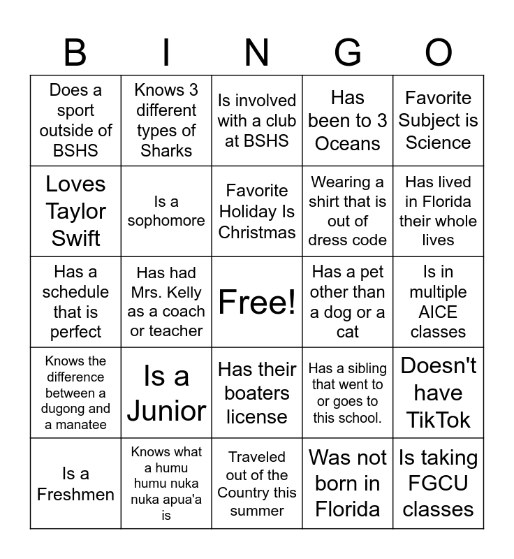 This bingo card has a free space and 29 words: Is a Freshmen, Is a Senior, Has had Mrs. Kelly as a coach or teacher, Does a sport at BSHS, Does a sport outside of BSHS, Is involved with a club at BSHS, Is a sophomore, Is a Junior, Has a pet other than a dog or a cat, Knows what a humu humu nuka nuka apua'a is, Is in multiple AICE classes, Is taking FGCU classes, Traveled out of the Country this summer, Was not born in Florida, Has lived in Florida their whole lives, Is Scuba Certified, Has their boaters license, Knows the difference between a dugong and a manatee, Favorite Subject is Science, Has a schedule that is perfect, Has a sibling that went to or goes to this school., Already has gotten in trouble for having their phone today, Wearing a shirt that is out of dress code, Loves Taylor Swift, Has been to 3 Oceans, Knows 3 different types of Sharks, Doesn't have TikTok, Favorite Holiday Is Christmas and Knows a good knock knock joke off of the top of their head (Yes you have to tell it).