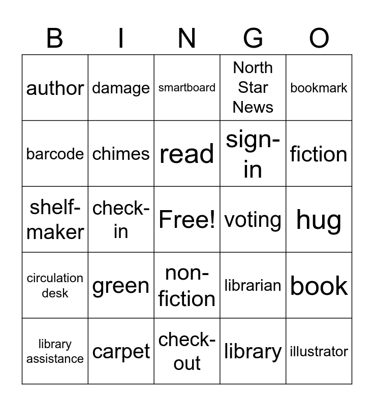 This bingo card has a free space and 24 words: green, carpet, read, library assistance, bookmark, author, barcode, damage, voting, non- fiction, sign-in, shelf-maker, librarian, book, chimes, library, hug, smartboard, fiction, check-in, illustrator, circulation desk, North Star News and check-out.