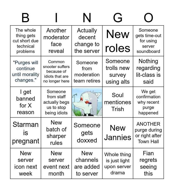 This bingo card has a free space and 24 words: New batch of sharper rules, New server event next month, Someone from moderation team retires, New server icon next week, Someone gets time-out for using server soundboard, The whole thing gets cut short due technical problems, "Purges will continue until morality changes.", Another moderator face reveal, Soul mentiones Trish, Someone gets doxxed, Someone trolls new survey using alts, I get banned for X reason, New Jannies, ANOTHER purge during or right after Town Hall, Common snooter suffers because of idiots that are no longer here, Whole thing is just light upon server drama, We get confirmation why recent purge happened, Actually decent change to the server, Nothing regarding lit-class is said, Someone from staff actually begs us to stop being idiots, Fian regrets seeing this, Starman is pregnant, New roles and New channels are added to server.