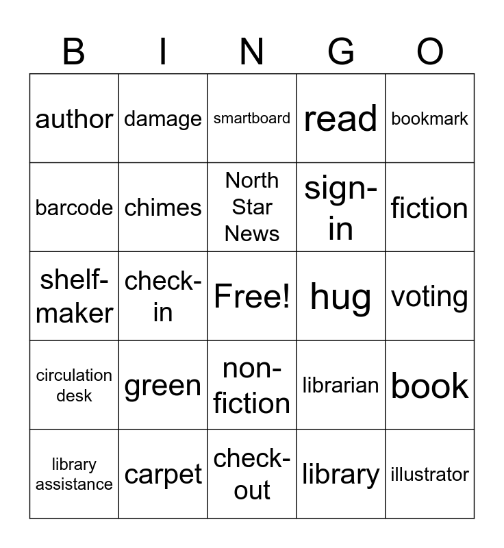 This bingo card has a free space and 24 words: green, carpet, North Star News, library assistance, bookmark, author, barcode, damage, hug, non- fiction, sign-in, shelf-maker, librarian, book, chimes, library, voting, smartboard, fiction, check-in, illustrator, circulation desk, read and check-out.