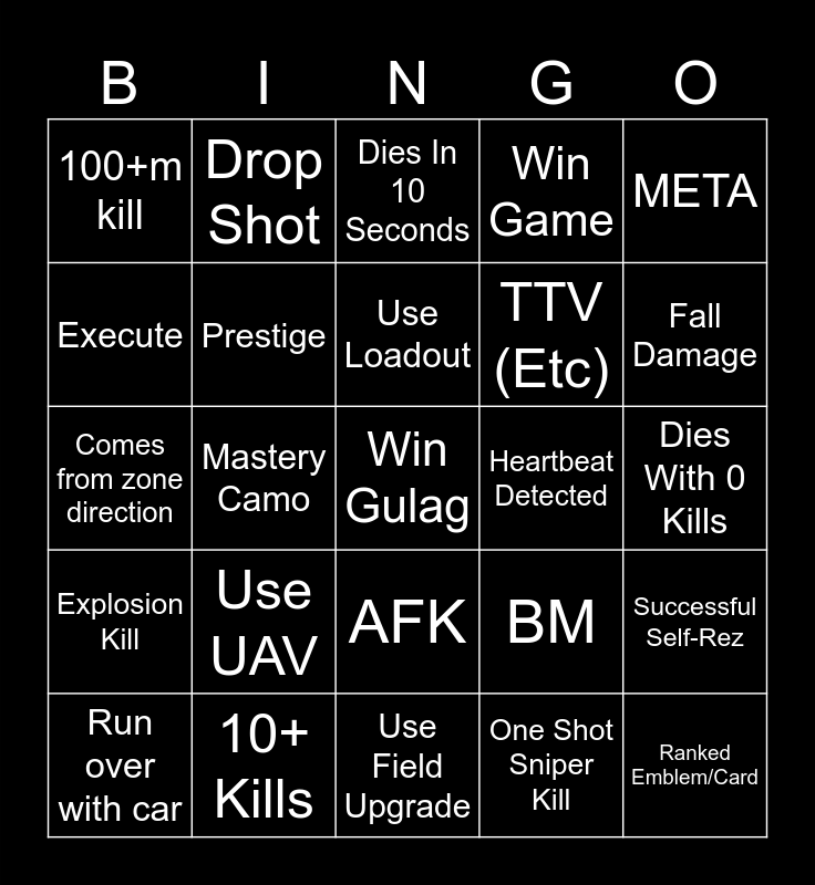This bingo card has a free space and 24 words: Use UAV, 10+ Kills, Use Loadout, Run over with car, META, 100+m kill, Execute, Drop Shot, Heartbeat Detected, AFK, TTV (Etc), Comes from zone direction, BM, Successful Self-Rez, Prestige, One Shot Sniper Kill, Dies With 0 Kills, Dies In 10 Seconds, Fall Damage, Mastery Camo, Ranked Emblem/Card, Explosion Kill, Win Game and Use Field Upgrade.