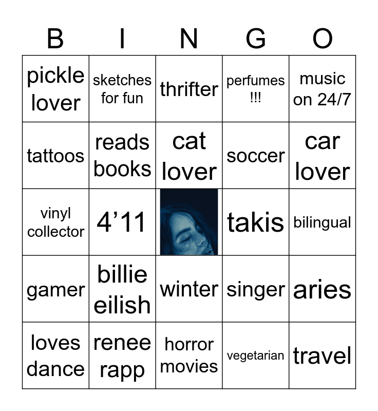 This bingo card has a free space and 24 words: loves dance, billie eilish, cat lover, vegetarian, music on 24/7, pickle lover, sketches for fun, thrifter, takis, bilingual, vinyl collector, reads books, singer, aries, tattoos, renee rapp, horror movies, perfumes !!!, car lover, gamer, 4’11, winter, soccer and travel.