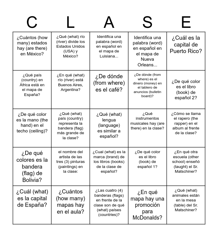 This bingo card has 25 words: el nombre del artista de las tres (3) pinturas (paintings) en la clase:, ¿Las cuatro (4) banderas (flags) en frente de la clase son de qué (what) países (countries)?, ¿De dónde (from where) es el café?, ¿Cuál (what) es la capital de España?, ¿Cuál es la capital de Puerto Rico?, ¿Cuántos (how many) estados hay (are there) en México?, ¿Qué país (country) en África está en el mapa de España?, ¿Qué (what) río (river) divide los Estados Unidos (USA) y México?, ¿Qué instrumentos musicales hay (are there) en la clase?, ¿Cual (what) es la marca (brand) de los libros (books) de la clase de español?, ¿De dónde (from where) es el dinero (money) en el tablero de anuncios (bulletin board)?, ¿De qué color es la mano (the hand) en el techo (ceiling)?, ¿De qué color es el libro (book) de español 1?, ¿En qué otra escuela (other school) enseñó (taught) el Sr. Matschiner?, ¿En qué (what) río (river) está Buenos Aires, Argentina?, ¿Qué (what) animales están en la mesa (table) del Sr. Matschiner?, ¿Cómo se llama el rapero (the rapper) en el album al frente de la clase?, Identifica una palabra (word) en español en el mapa de Luisiana..., ¿De qué color es el libro (book) de español 2?, ¿Qué (what) país (country) representa la bandera (flag) más grande de la clase?, ¿Qué (what) lengua (language) es similar a español?, ¿Cuántos (how many) mapas hay en el aula?, ¿De qué colores es la bandera (flag) de Bolivia?, Identifica una palabra (word) en español en el mapa de Nueva Orleans... and ¿En qué mapa hay una promoción para McDonalds?.