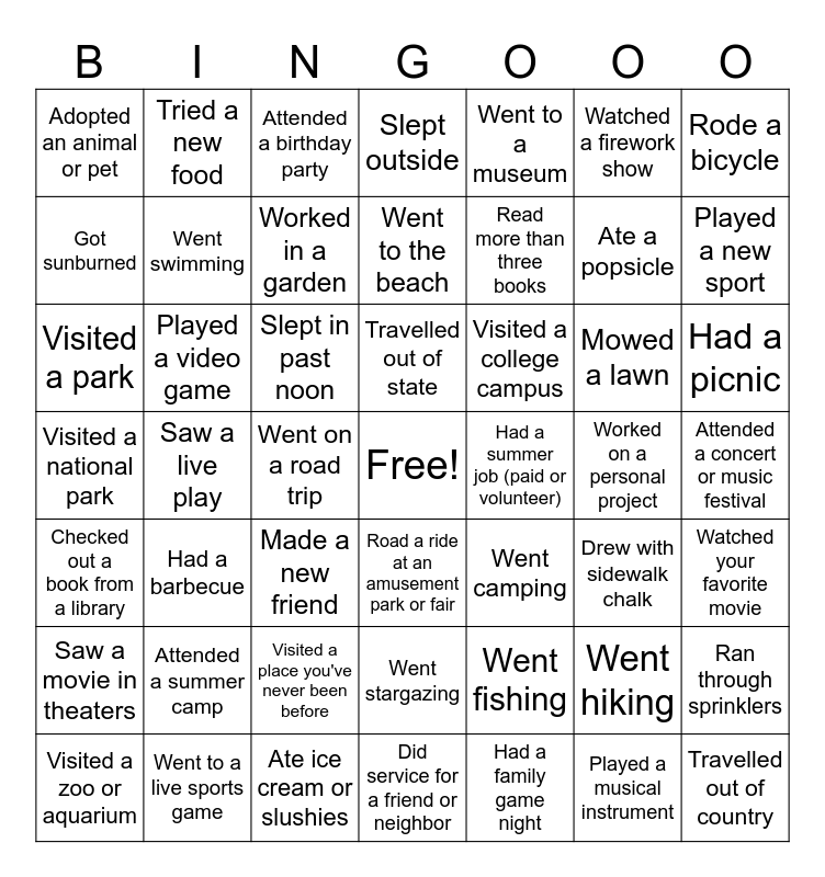 This bingo card has a free space and 48 words: Went fishing, Ate a popsicle, Did service for a friend or neighbor, Saw a live play, Slept in past noon, Attended a concert or music festival, Tried a new food, Went to a live sports game, Watched a firework show, Road a ride at an amusement park or fair, Rode a bicycle, Slept outside, Mowed a lawn, Visited a college campus, Saw a movie in theaters, Worked on a personal project, Got sunburned, Played a new sport, Went hiking, Went to a museum, Read more than three books, Went on a road trip, Adopted an animal or pet, Went swimming, Ran through sprinklers, Worked in a garden, Had a picnic, Visited a zoo or aquarium, Travelled out of state, Played a video game, Played a musical instrument, Had a summer job (paid or volunteer), Watched your favorite movie, Attended a summer camp, Visited a national park, Went camping, Drew with sidewalk chalk, Visited a park, Made a new friend, Visited a place you've never been before, Checked out a book from a library, Travelled out of country, Attended a birthday party, Ate ice cream or slushies, Went to the beach, Went stargazing, Had a barbecue and Had a family game night.