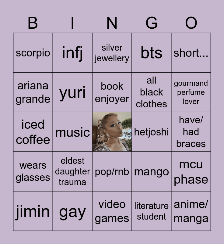 This bingo card has a free space and 24 words: eldest daughter trauma, gay, book enjoyer, jimin, short..., scorpio, ariana grande, infj, hetjoshi, pop/rnb, all black clothes, iced coffee, mango, mcu phase, yuri, literature student, have/ had braces, silver jewellery, gourmand perfume lover, music, anime/ manga, wears glasses, bts and video games.