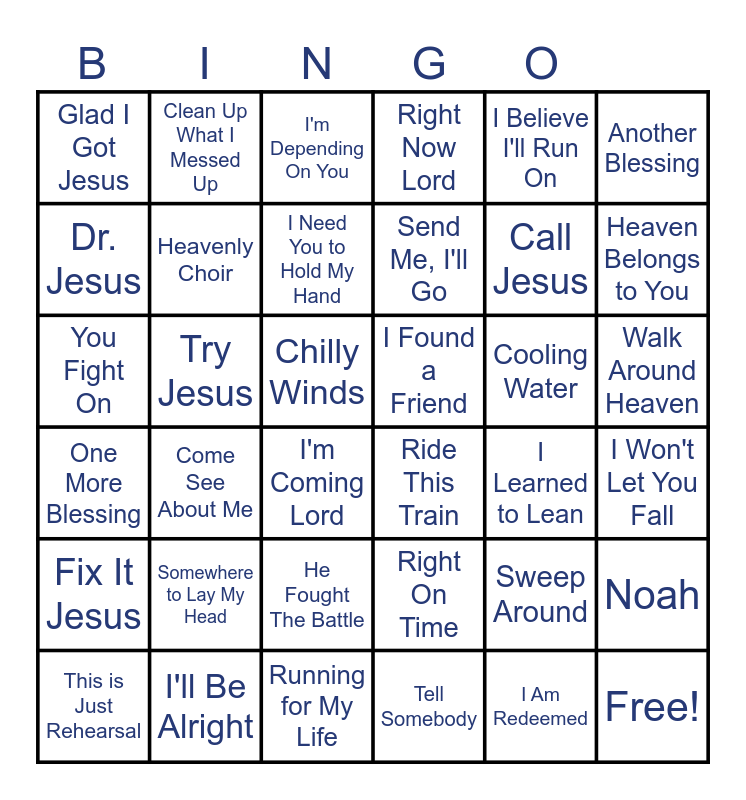 This bingo card has 42 words: I Am Redeemed, Heavenly Choir, Don't Call the Roll, Cooling Water, I Won't Let You Fall, Come See About Me, You Fight On, Still Here, I'm Depending On You, Walk Around Heaven, Chilly Winds, Send Me, I'll Go, Heaven Belongs to You, I Believe I'll Run On, I'll Be Alright, One More Blessing, Noah, Call Jesus, Free!, Clean Up What I Messed Up, Another Blessing, He Fought The Battle, Fix It Jesus, Glad I Got Jesus, Prayer Changes Things, This is Just Rehearsal, I Need You to Hold My Hand, Show Me The Way, Somewhere to Lay My Head, Sweep Around, Thunder, I Found a Friend, Dr. Jesus, I Learned to Lean, Running for My Life, I'm Coming Lord, Ride This Train, Try Jesus, Right On Time, Tell Somebody, Right Now Lord and Harvest Time.
