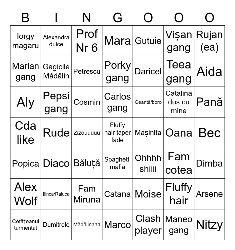 This bingo card has a free space and 80 words: Suicide squad, Ilinca/Raluca, Prof Nr 6, Fluffy hair, Grup 10 plus, Fane/Jean, Dimba, Erika, Fam cotea, Cetățeanul turmentat, Oana, Fam Stoica, Mara, Iorgy magaru, Kendama, Vișan gang, Diaco, Cosmin, Copil cu Labubu, Aly, Ohhhh shiiii, Gutuie, Porky gang, Marian gang, Rujan (ea), Clash player, Dumitrele, Marco, Ale02, Jacs gang, Petrescu, Dragomir, Rude, Nitzy, Pană, Aida, Denisa gang, Județ, Spaghetti mafia, Teea gang, Mașinita, Moise, Anuța, Faraonii, Băluță, Alexandra dulce, Bec, Popica, Mihnea, Căști la concert, Catalina dus cu mine, Daricel, Geantă/boro, Robica Alexandra, Titi, Peco, Alex Wolf, Ochi de sticlă, Maneo gang, Carlos gang, Gagicile Mădălin, Walter White wannabe, Mirela, Dna păpușă, Mihăiță, Frizeri, Negru, Irina Vintilă, Fam Miruna, Cola cu numele nostru, Pepsi gang, Cda like, Coleg Fane, Mădălinaaa, Catana, Bărbat cu slimuri, Zizouuuuu, Giulia, Arsene and Omul 75%.