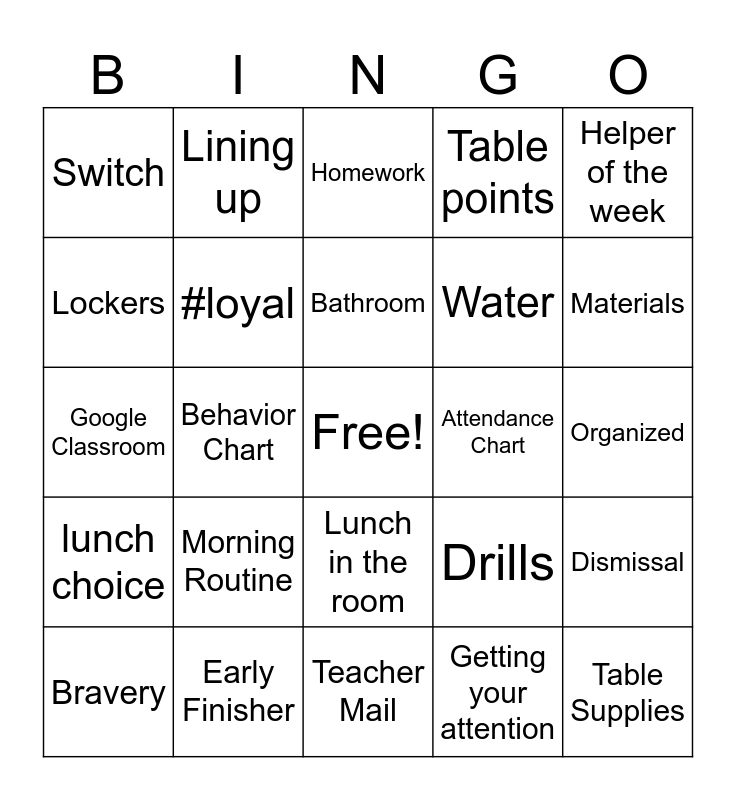 This bingo card has a free space and 24 words: Morning Routine, Early Finisher, Bathroom, Bravery, Helper of the week, Switch, Lockers, Lining up, Attendance Chart, Lunch in the room, Water, Google Classroom, Drills, Dismissal, #loyal, Getting your attention, Organized, Homework, Materials, Behavior Chart, Table Supplies, lunch choice, Table points and Teacher Mail.