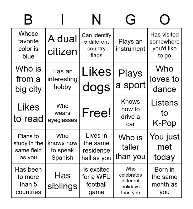 This bingo card has a free space and 24 words: Who knows how to speak Spanish, Has siblings, Likes dogs, Has been to more than 5 countries, Has visited somewhere you'd like to go, Whose favorite color is blue, Who is from a big city, A dual citizen, Knows how to drive a car, Lives in the same residence hall as you, Plays a sport, Likes to read, Who is taller than you, You just met today, Has an interesting hobby, Who celebrates different holidays than you, Listens to K-Pop, Can identify 5 different country flags, Who loves to dance, Who wears eyeglasses, Born in the same month as you, Plans to study in the same field as you, Plays an instrument and Is excited for a WFU football game.