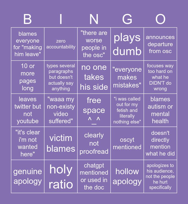 This bingo card has a free space and 24 words: victim blames, holy ratio, no one takes his side, genuine apology, announces departure from osc, blames everyone for "making him leave", 10 or more pages long, zero accountability, "i was called out for my fetish and literally nothing else", clearly not proofread, "everyone makes mistakes", leaves twitter but not youtube, oscyt mentioned, doesn't directly mention what he did, types several paragraphs but doesn't actually say anything, hollow apology, blames autism or mental health, "there are worse people in the osc", focuses way too hard on what he DIDN'T do wrong, "waaa my non-existy video suffered", apologizes to his audience, not the people he hurt specifically, "it's clear i'm not wanted here", plays dumb and chatgpt mentioned or used in the doc.
