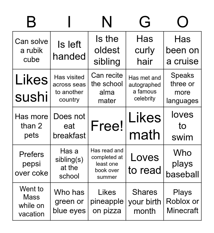 This bingo card has a free space and 24 words: Went to Mass while on vacation, Has a sibling(s) at the school, Can recite the school alma mater, Shares your birth month, Has been on a cruise, Can solve a rubik cube, Is left handed, Is the oldest sibling, Likes math, loves to swim, Has more than 2 pets, Has visited across seas to another country, Loves to read, Who plays baseball, Likes sushi, Who has green or blue eyes, Likes pineapple on pizza, Has curly hair, Speaks three or more languages, Prefers pepsi over coke, Does not eat breakfast, Has read and completed at least one book over summer, Has met and autographed a famous celebrity and Plays Roblox or Minecraft.