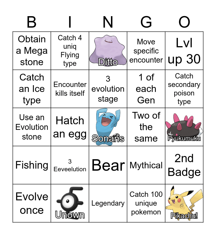 This bingo card has 5 images and 25 words: 3 Eeveelution, Legendary, 3 evolution stage, Evolve once, Lvl up 30, Obtain a Mega stone, Catch an Ice type, Catch 4 uniq Flying type, Two of the same, Bear, 1 of each Gen, Use an Evolution stone, Mythical, 2nd Badge, Encounter kills itself, Pikachu!, Pyukumuku, Ditto, Catch secondary poison type, Hatch an egg, Sonans, Unown, Fishing, Move specific encounter and Catch 100 unique pokemon.