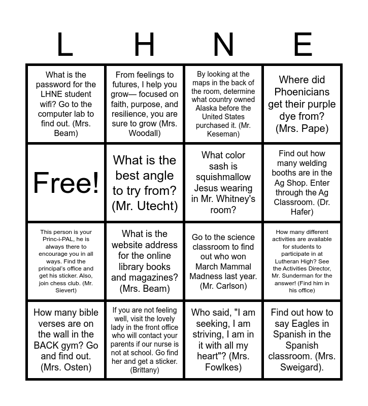 This bingo card has 16 words: If you are not feeling well, visit the lovely lady in the front office who will contact your parents if our nurse is not at school. Go find her and get a sticker. (Brittany), How many different activities are available for students to participate in at Lutheran High? See the Activities Director, Mr. Sunderman for the answer! (Find him in his office), By looking at the maps in the back of the room, determine what country owned Alaska before the United States purchased it. (Mr. Keseman), What is the password for the LHNE student wifi? Go to the computer lab to find out. (Mrs. Beam), This person is your Princ-i-PAL, he is always there to encourage you in all ways. Find the principal’s office and get his sticker. Also, join chess club. (Mr. Sievert), From feelings to futures, I help you grow— focused on faith, purpose, and resilience, you are sure to grow (Mrs. Woodall), Go to the science classroom to find out who won March Mammal Madness last year. (Mr. Carlson), Who said, "I am seeking, I am striving, I am in it with all my heart"? (Mrs. Fowlkes), Free!, What is the best angle to try from? (Mr. Utecht), How many bible verses are on the wall in the BACK gym? Go and find out. (Mrs. Osten), Where did Phoenicians get their purple dye from? (Mrs. Pape), What is the website address for the online library books and magazines? (Mrs. Beam), Find out how many welding booths are in the Ag Shop. Enter through the Ag Classroom. (Dr. Hafer), What color sash is squishmallow Jesus wearing in Mr. Whitney's room? and Find out how to say Eagles in Spanish in the Spanish classroom. (Mrs. Sweigard)..