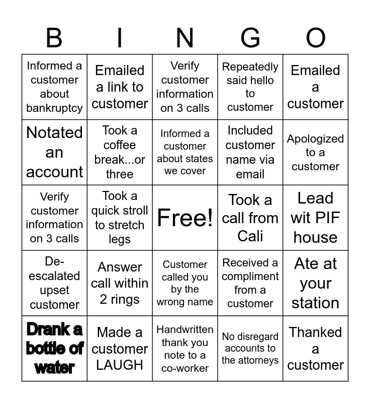 This bingo card has a free space and 29 words: Drank a bottle of water, Sent a gif to a co-worker, Took a quick stroll to stretch legs, Did chair yoga, Informed a customer about bankruptcy, Verify customer information on 3 calls, Took a coffee break...or three, Answer call within 2 rings, Took a call from Cali, Made a customer LAUGH, Lead wit PIF house, Thanked a customer, Handwritten thank you note to a co-worker, No disregard accounts to the attorneys, Apologized to a customer, Took a call from Arizona call, Customer called you by the wrong name, De-escalated upset customer, Emailed a customer, Verify customer information on 3 calls, Received a compliment from a customer, Talked about the weather with a customer, Included customer name via email, Notated an account, Repeatedly said hello to customer, Emailed a link to customer, Ate at your station, Informed a customer about states we cover and Wrote in slack.