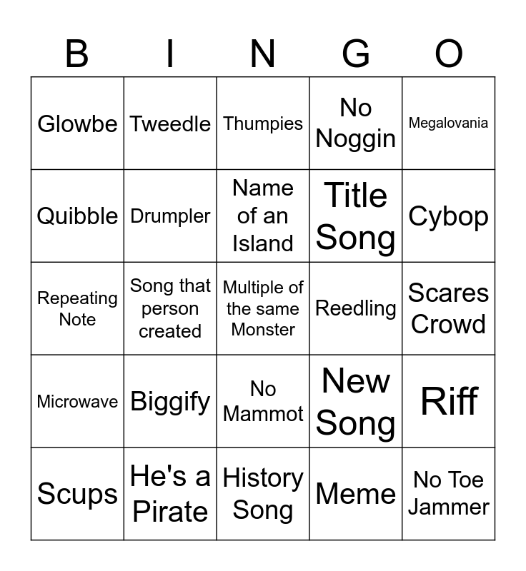 This bingo card has 25 words: Microwave, He's a Pirate, Multiple of the same Monster, Meme, Megalovania, Glowbe, Tweedle, Thumpies, Reedling, Riff, Quibble, Drumpler, History Song, New Song, Cybop, Scups, Song that person created, Name of an Island, Title Song, Scares Crowd, Repeating Note, Biggify, No Mammot, No Noggin and No Toe Jammer.