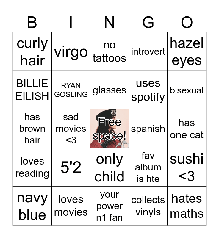 This bingo card has a free space and 24 words: 5'2, loves movies, glasses, navy blue, hazel eyes, curly hair, BILLIE EILISH, virgo, spanish, only child, uses spotify, has brown hair, fav album is hte, sushi <3, RYAN GOSLING, collects vinyls, has one cat, no tattoos, bisexual, sad movies <3, hates maths, loves reading, introvert and your power n1 fan.