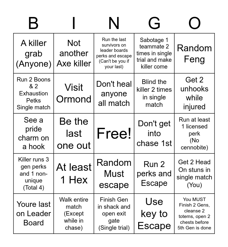 This bingo card has a free space and 24 words: At least 1 Hex, Walk entire match (Except while in chase), Don't heal anyone all match, Youre last on Leader Board, Random Feng, A killer grab (Anyone), Run 2 Boons & 2 Exhaustion Petks Single match, Not another Axe killer, Don't get into chase 1st, Random Must escape, Blind the killer 2 times in single match, See a pride charm on a hook, Run 2 perks and Escape, Get 2 Head On stuns in single match (You), Visit Ormond, Use key to Escape, Run at least 1 licensed perk (No cennobite), Run the last survivors on leader boards perks and escape (Can't be you if your last), Get 2 unhooks while injured, Be the last one out, You MUST Finish 2 Gens, cleanse 2 totems, open 2 chests before 5th Gen is done, Killer runs 3 gen perks and 1 non-unique (Total 4), Sabotage 1 teammate 2 times in single trial and make killer come and Finish Gen in shack and open exit gate (Single trial).