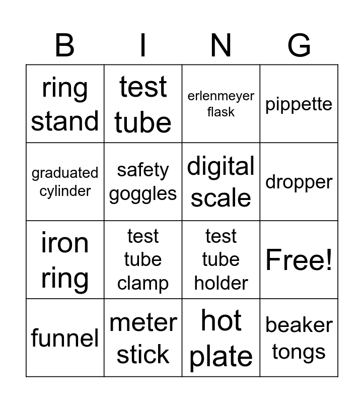 This bingo card has 20 words: Free!, beaker, erlenmeyer flask, volumetric flask, funnel, graduated cylinder, meter stick, ring stand, iron ring, test tube, test tube clamp, test tube holder, safety goggles, beaker tongs, digital scale, wire brush, dropper, pippette, hot plate and ruler.