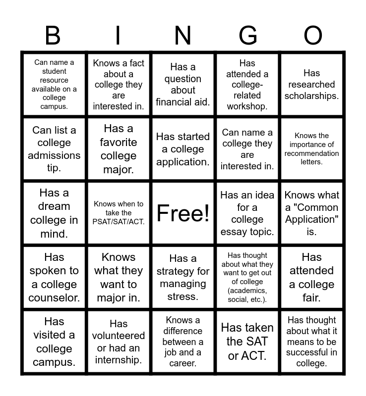 This bingo card has a free space and 24 words: Has visited a college campus., Knows what they want to major in., Has started a college application., Has taken the SAT or ACT., Has researched scholarships., Can name a student resource available on a college campus., Knows a fact about a college they are interested in., Has a question about financial aid., Has an idea for a college essay topic., Knows what a "Common Application" is., Has a dream college in mind., Has a favorite college major., Has thought about what they want to get out of college (academics, social, etc.)., Has attended a college fair., Can list a college admissions tip., Has volunteered or had an internship., Knows a difference between a job and a career., Has attended a college-related workshop., Knows the importance of recommendation letters., Has spoken to a college counselor., Knows when to take the PSAT/SAT/ACT., Has a strategy for managing stress., Can name a college they are interested in. and Has thought about what it means to be successful in college..