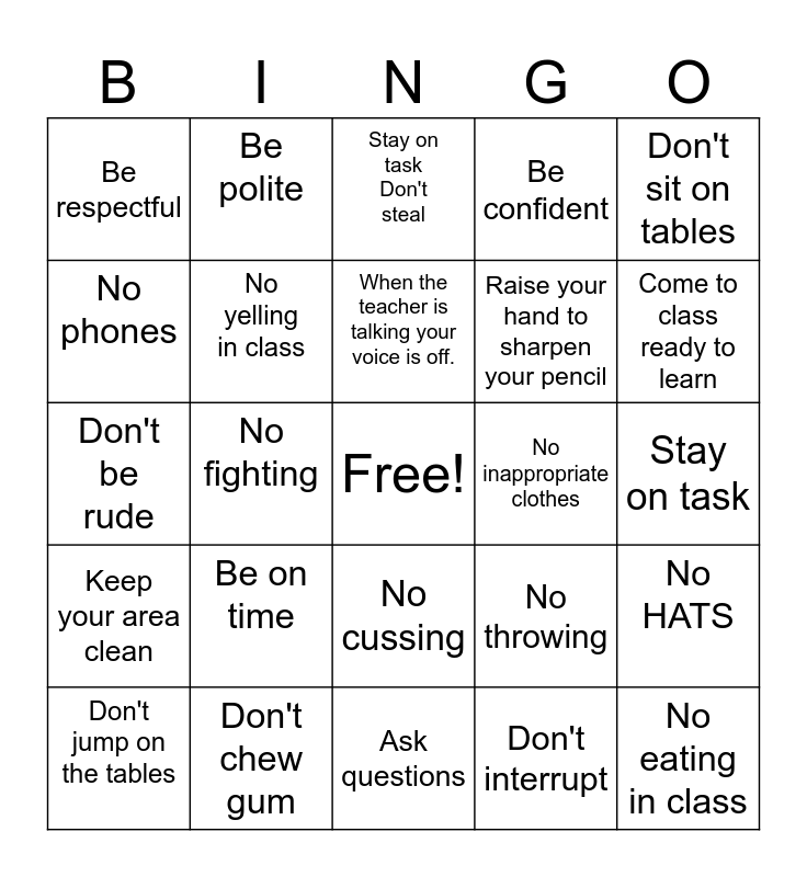 This bingo card has a free space and 24 words: Be on time, Don't chew gum, When the teacher is talking your voice is off., Don't jump on the tables, Don't sit on tables, Be respectful, No phones, Be polite, No inappropriate clothes, No cussing, Raise your hand to sharpen your pencil, Don't be rude, No throwing, No HATS, No yelling in class, Don't interrupt, Stay on task, Stay on task Don't steal, Come to class ready to learn, No fighting, No eating in class, Keep your area clean, Be confident and Ask questions.