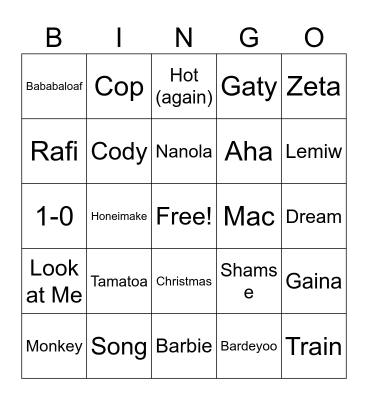 This bingo card has a free space and 52 words: Moon, Train, Judy, Barbie, Tamatoa, Bear, Cop, STX, Rafi, Bridge, Cody, G, Gaina, Shams e, Zowenon, Road, Nanola, Mac, Cough, Zeta, Honeimake, Bardeyoo, Bababaloaf, Aha, Bonoboxing, Was, A, Hot, Lemiw, Mondo, Crying, Gaty, Sally, Buhihozelir, Chiropractor, Hot (again), Song, Silence, Aah, the End, Sausage, Dream, Look at Me, Gift, Christmas, 8, Sonic, 1-0, Laughing, Itchy, Monkey and Plug.